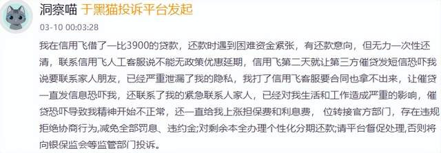 字据花消者投诉信息,信用飞催收存在短信、电话欺诈,表露隐秘、计划家东说念主与一又友,以致淆乱责任单元、计划引导与共事等步履,严重影响了花消者的生存与责任,许多花消者还因此出现精神问题。