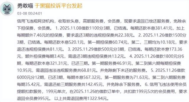 在“黑猫投诉”平台,关联信用飞“印子钱”“砍头息”的投诉居高不下。