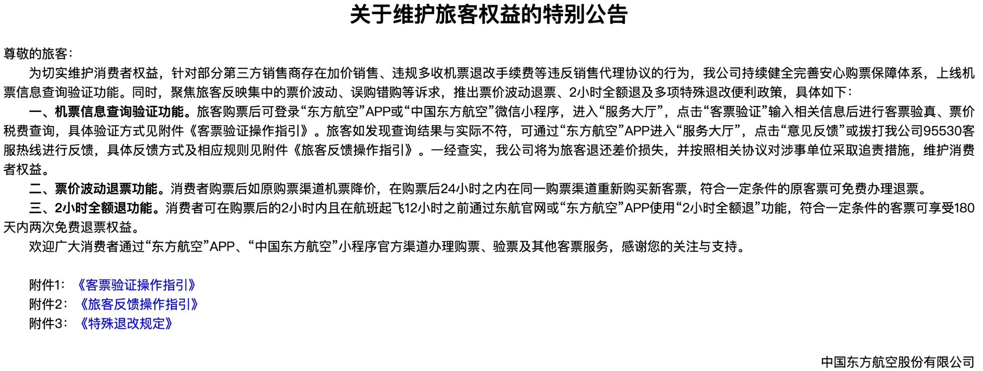 除了与前年相似提醒游客可在航司官方平台进行客票验真、票价税费查询,三大航本年还建议购票后24小时之内发现更低廉的机票可免费退票的新规。